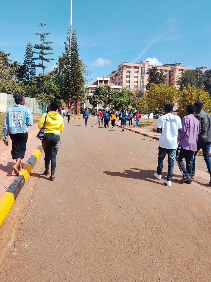 The scene depicts an outdoor pathway in Karingani ward, Kenya, on a clear, sunny day. Approximately twenty to thirty individuals, predominantly young adults, are observed walking in various directions on a reddish-brown asphalt path. On the left, two females walk away from the camera; one wears a light blue denim jacket with patches and a black skirt, while the other wears a yellow hooded sweatshirt and dark pants, carrying a dark shoulder bag. On the right, three males walk away from the camera; one wears a white t-shirt, blue jeans, and white sneakers, another a purple t-shirt and dark pants, and the third a dark patterned shirt and blue jeans. The pathway is bordered on the left by a yellow and black painted curb, adjacent to a red brick pedestrian area. Tall conifer-like trees and other green foliage line the path. In the background, several multi-story buildings with light-colored facades are visible under a bright blue sky with scattered clouds. A tall white pole stands erect in the mid-ground. Sunlight casts distinct shadows of the people on the pathway.
