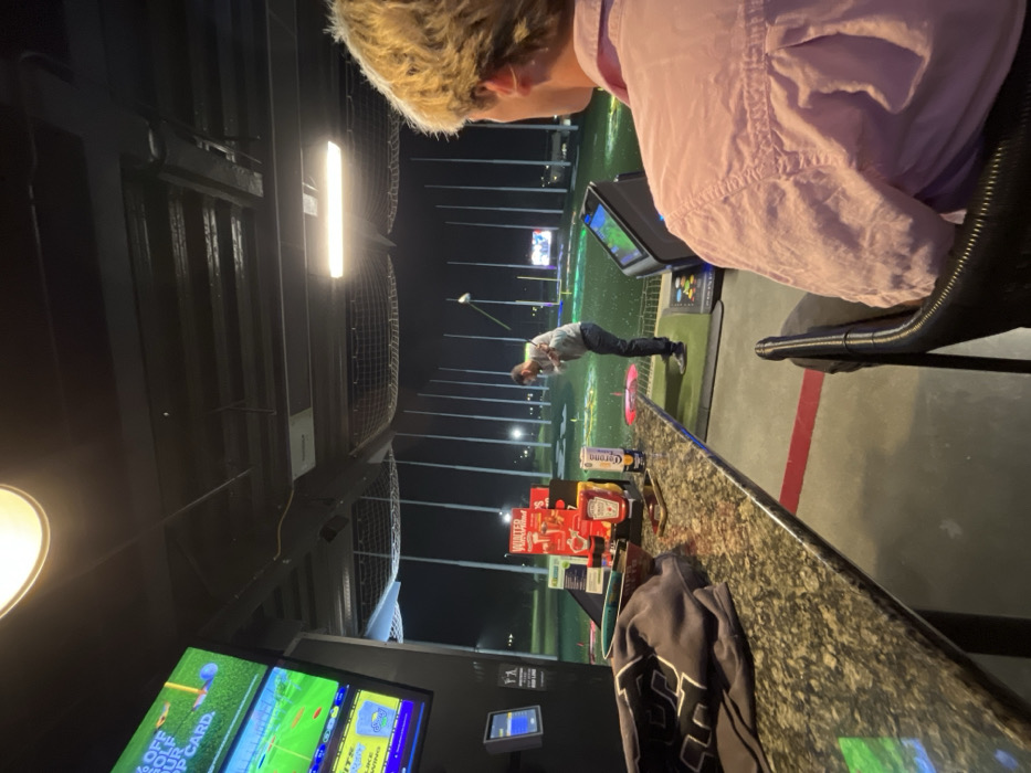 Inside a Topgolf facility, the view is captured from a seated vantage point beside a patterned countertop, displaying condiments, a Corona bottle, and apparel. In the background, a golfer is in mid-swing on the turf. Beyond him, the Topgolf range extends into the night, illuminated by numerous lights and netting. The facility's interior features overhead lighting and a screen showing game information. A person with blond hair and a pink shirt is seated near the camera.
