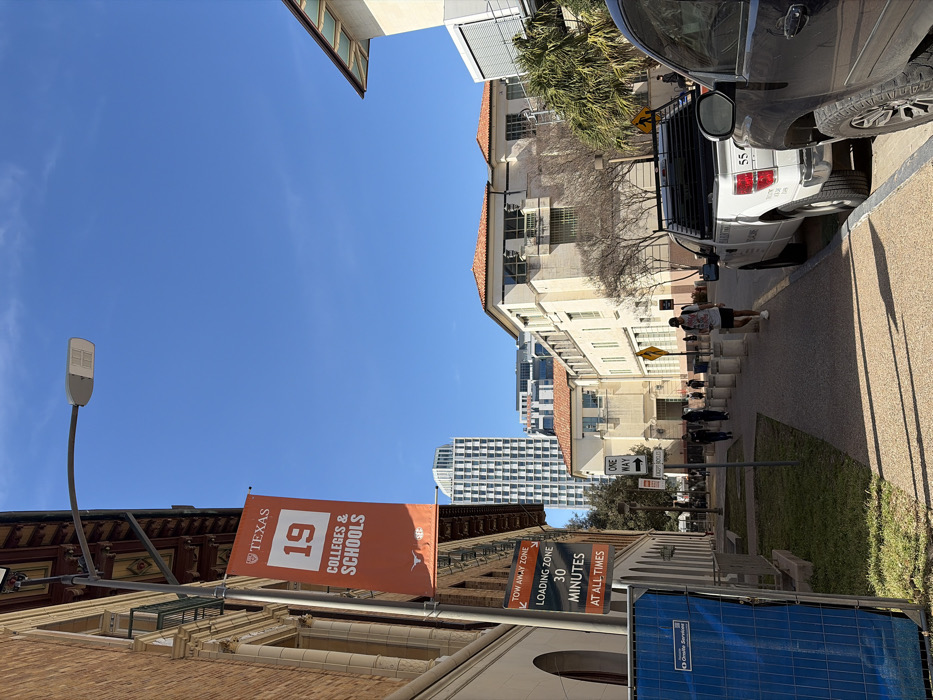 An outdoor scene shows a street with buildings on both sides under a clear blue sky. A Texas University banner hanging from a building reads "19 Colleges & Schools." Adjacent to it, a parking sign indicates "Tow Away Zone, Loading Zone, 30 Minutes at All Times." A "One Way" sign is visible. A line of people and a white truck are on the street, next to an area marked off by concrete barriers and a blue construction fence.