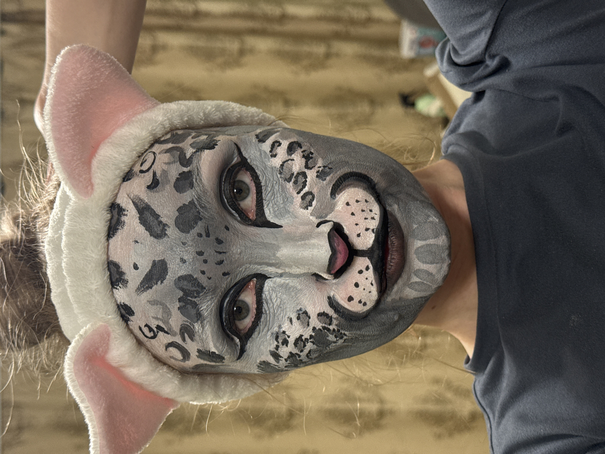 A close-up, tilted, indoor shot depicts a person wearing a light-colored hat with pink inner ears and sporting gray and black snow leopard face paint