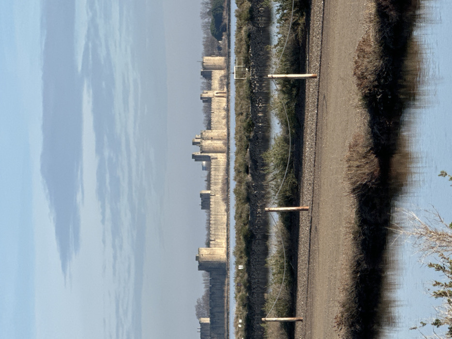 The image depicts the medieval fortified city of Aigues-Mortes, Gard, France, observed from a distance across a series of salt marshes and waterways. The sky is light blue with scattered, thin stratocumulus clouds. The extensive, light-colored stone city walls, featuring numerous rectangular crenellated towers and connecting battlements, stretch horizontally across the mid-ground, illuminated by direct sunlight. A calm body of water, likely a canal or a section of a salt marsh, lies immediately in front of the city walls, reflecting the sky. This water body is separated from the foreground by a strip of low-lying, dry, brownish-green scrub vegetation. In the immediate foreground, a dirt or gravel path is visible, with two weathered wooden posts connected by a taut light-colored rope, forming a barrier. Another narrow channel of water is present below the path. No people, vehicles, or overt human activity are present in the scene. The lighting suggests a clear day, with shadows indicating a low sun angle from the left.