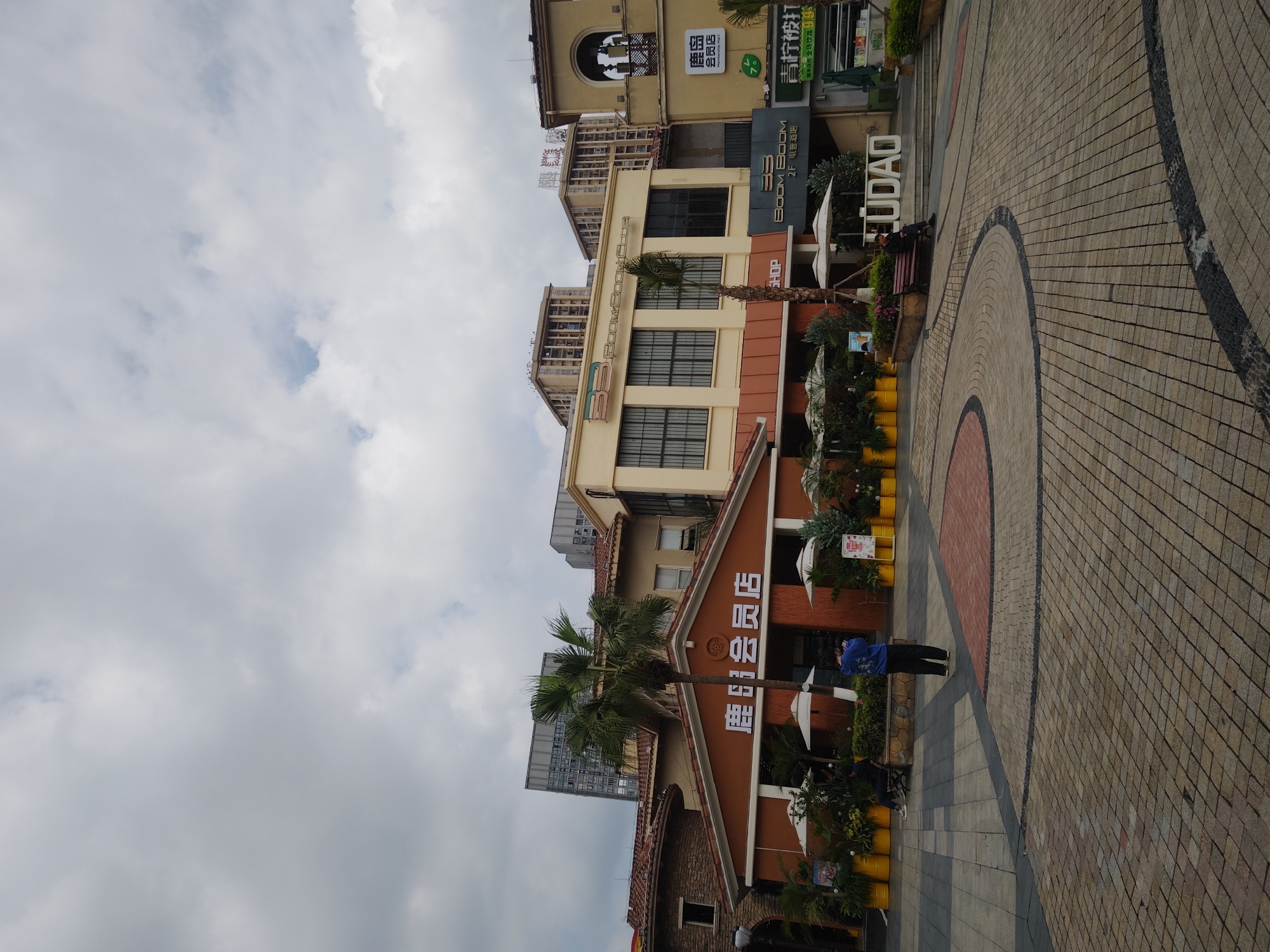 Here's a description of the image: The image shows a pedestrian area in what appears to be a commercial or shopping district. There is a building with signage in Chinese characters, including "鹿会员店" (Lu Huiyuan Dian), which translates to "Deer Member Store". The building has a brown and cream color scheme with visible windows and a red-tiled roof. There are palm trees and other greenery in front of the building. A person in a blue shirt stands on the paved area in front of the shop. Other signs like "BOOM BOOM CLUB" can be seen on nearby buildings. The sky above is overcast. Based on the OCR, the image appears to be taken in the Chongqing High-tech Zone, China.