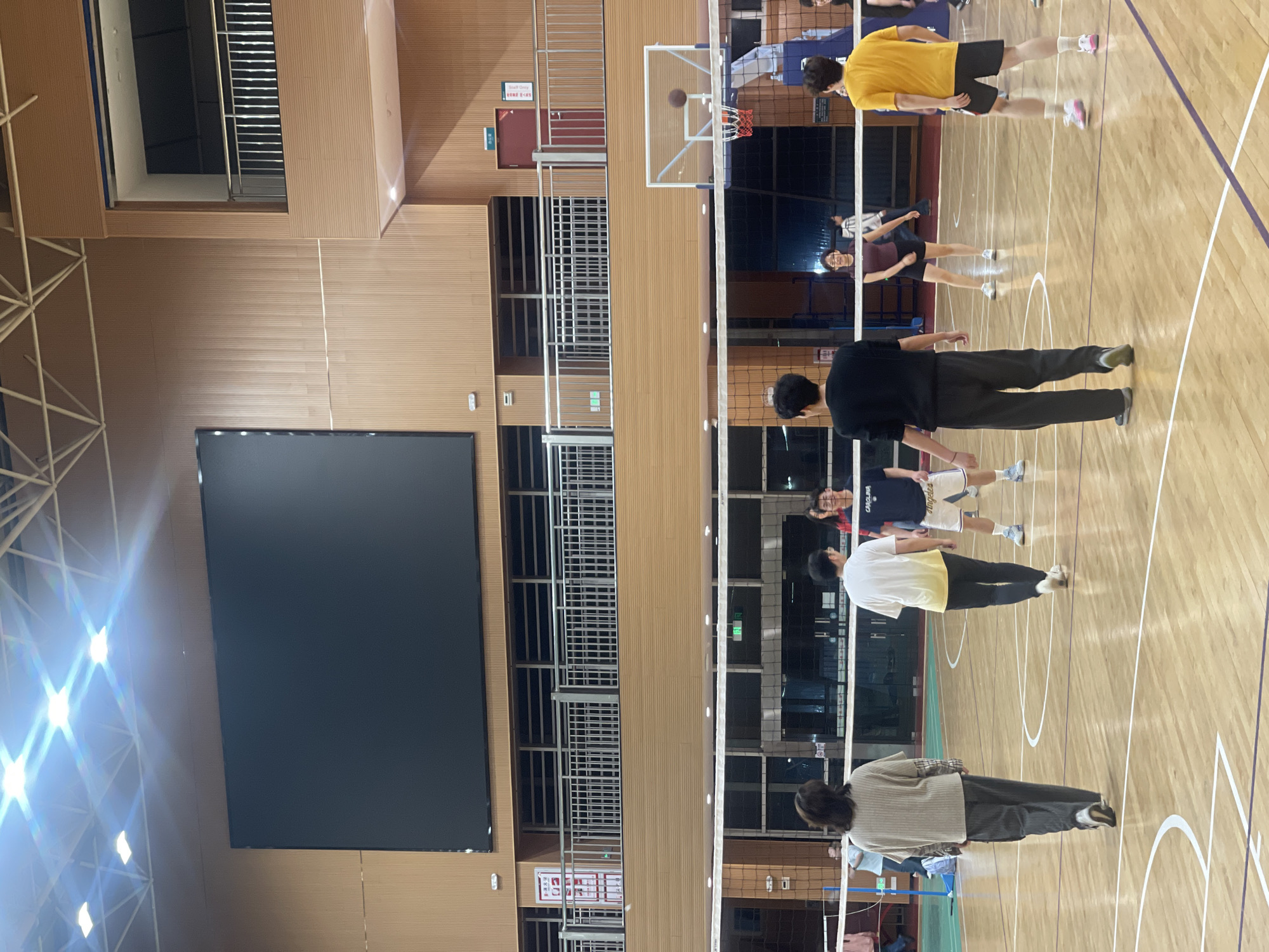n indoor gymnasium with people playing volleyball. The court is marked with lines, and a net divides the playing area. There are several people on both sides of the net, some actively playing while others are watching. One person is in the act of spiking the ball. A basketball hoop is visible near one end of the court. A large screen is mounted on the wall, with a wooden paneling backdrop. The gymnasium is located in the city of Chongqing High-tech Zone, China.