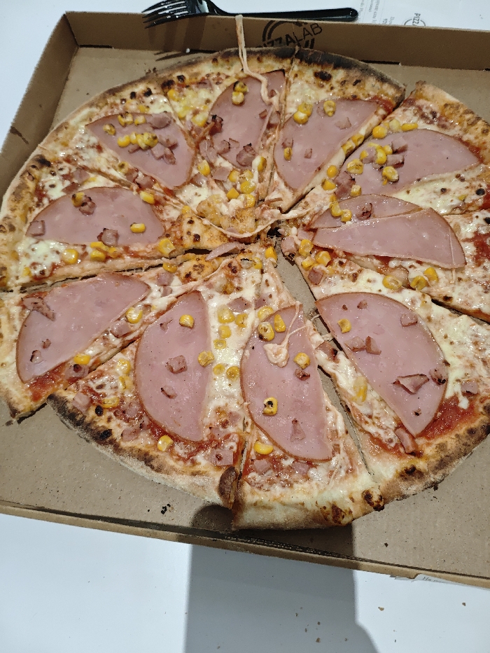 A circular pizza, approximately 12-14 inches in diameter, rests inside a light brown corrugated cardboard delivery box. The pizza is precisely cut into ten radial wedges. Its surface is covered with melted white cheese and red tomato sauce, topped with numerous large, thinly sliced pieces of light pink ham, and scattered yellow corn kernels. Smaller diced pieces of ham are visible amongst the main toppings. The pizza's crust is visibly thick, airy, and exhibits areas of dark charring consistent with high-temperature baking. A black plastic fork is positioned on the inner rim of the pizza box in the upper right. The interior lid flap of the box prominently displays the "PIZZALAB" brand name. The pizza box is situated on a flat, white surface, with a faint shadow cast in the lower right. Based on the visible "PIZZALAB" branding, the pizza originates from a Pizzalab establishment in the city of Plovdiv, Bulgaria. No people, specific actions, or interactions are observable.