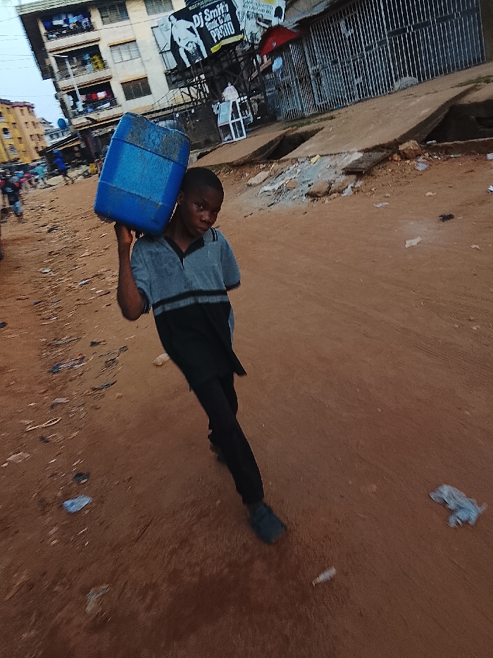 A young person carries a blue plastic container on their left shoulder while walking on a dirt road. The individual wears a short-sleeved shirt with a dark lower section and dark pants. Buildings and a billboard are visible in the background, indicating an urban or semi-urban setting. The road appears to be littered with debris. The photograph's perspective is slightly angled and at eye level with the subject.