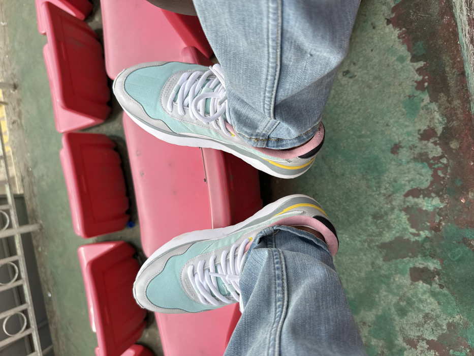 A person wearing light-wash jeans and mint green and white sneakers sits in a stadium. The seats are bright pink. The person's feet are resting on the back of the seat in front of them. The stadium floor is a mottled green and red. Metal railings are visible to the left. The sneakers have white laces and a stacked heel with yellow, pink, and black accents.