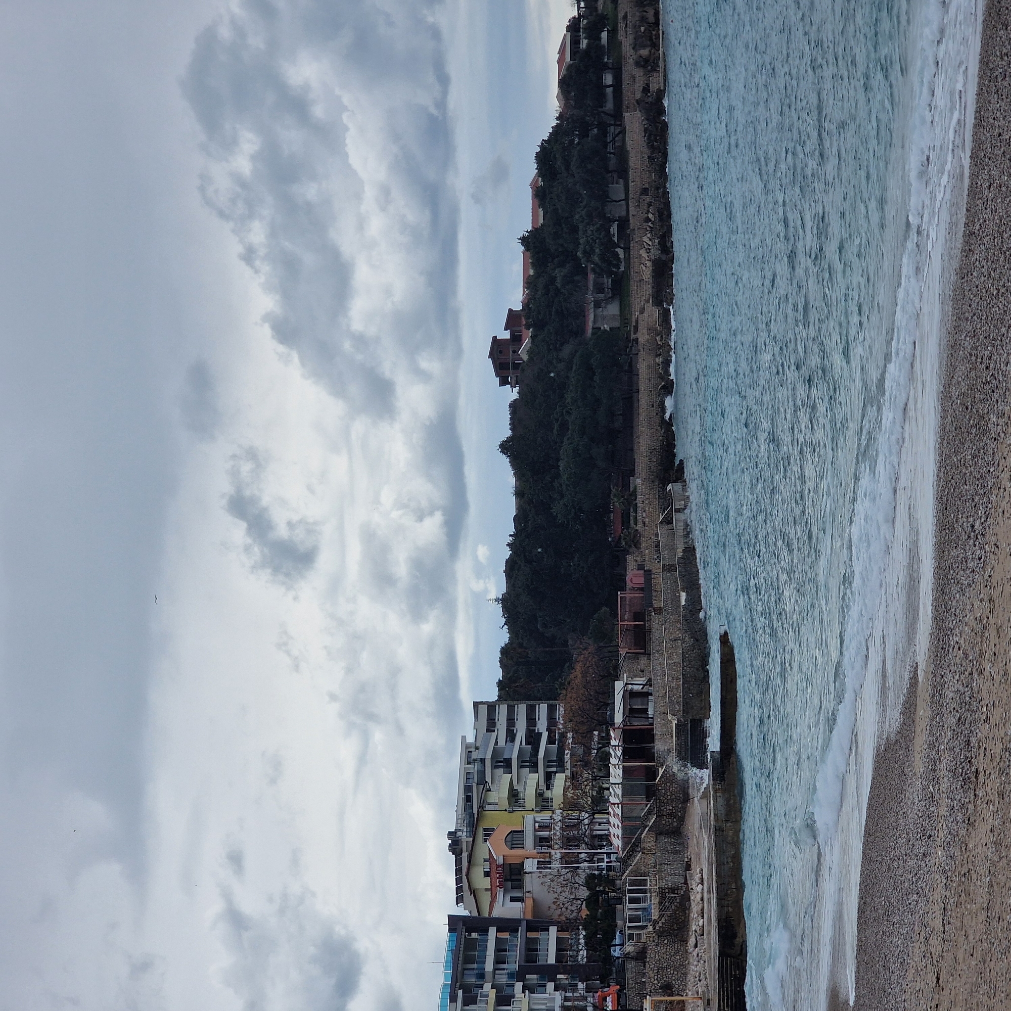 The image depicts a coastal scene in Dobra Voda, Montenegro, under an overcast sky. The foreground features a pebble and sand beach extending into the frame's lower right. The water, a teal-blue, shows active wave patterns with white foam at the shoreline and ripples further out. The midground and background comprise a developed coastline. To the left, a cluster of multi-story buildings, appearing to be residential or hotel structures, are visible. These buildings exhibit various pastel and neutral colors (white, yellow, orange, light blue, grey) and feature numerous balconies. Solar panels are visible on some rooftops. Below these structures, a series of terraced stone walls and concrete platforms descend towards the water. Several single-story structures with striped awnings, likely commercial establishments, are situated at the base of the buildings. A red vehicle and a light-colored car are partially discernible amidst these lower structures. Towards the center and right, the coastline is characterized by a dense, dark green tree line covering a sloped terrain. Within and above this foliage, several buildings are present, featuring reddish-brown tiled roofs and lighter-colored facades. One building on the far right appears to be an unfinished structure with visible exposed brickwork. The base of the coastline in this section consists of stone retaining walls and natural rock formations meeting the water, where waves are visibly breaking against them. The sky is uniformly overcast with shades of grey clouds. Two small, dark aerial objects, possibly birds, are present in the upper left quadrant of the sky. No individuals are visible in the scene.