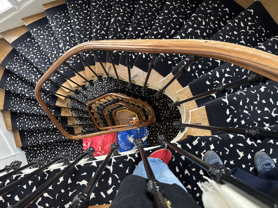 An overhead view captures a multi-story spiral staircase within a residential building in Paris, France. The staircase features wooden steps covered by dark carpet runners displaying a white, irregular speckled pattern. A black, ornate wrought-iron balustrade with a polished wooden handrail spirals downward into a central well. Two individuals are partially visible from the waist down at the top of the stairs, positioned on the carpeted steps. One person wears blue jeans and bright red shoes. The second person wears dark trousers and blue-grey shoes, with a cream-colored garment or bag visible near their leg. Two large, full bags rest on one of the upper carpeted steps: a red bag, partially labeled "SCHIESSER," and a blue bag marked "BLANCHISSEUR" (laundry service). The upper walls appear white, indicating an interior setting.