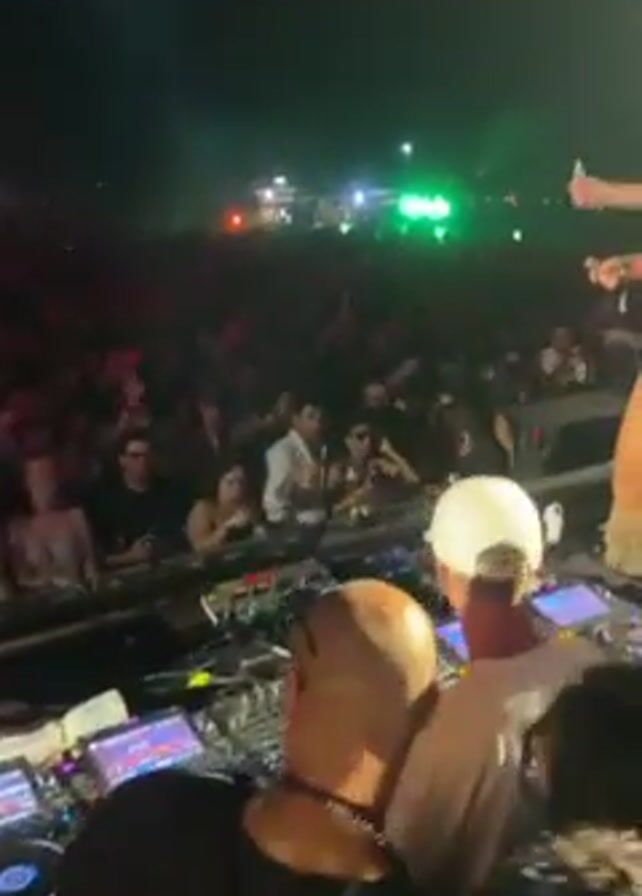 nighttime scene at an outdoor concert or festival. The camera is positioned behind the DJ booth, focusing on the DJ equipment and the crowd in front. Two DJs are visible operating the equipment. The crowd is large, consisting of many people standing close together, and some are dancing. There are colorful stage lights projecting into the audience, indicating a vibrant and energetic atmosphere. The overall setting is dark, lit primarily by the stage lights and some background illumination.
