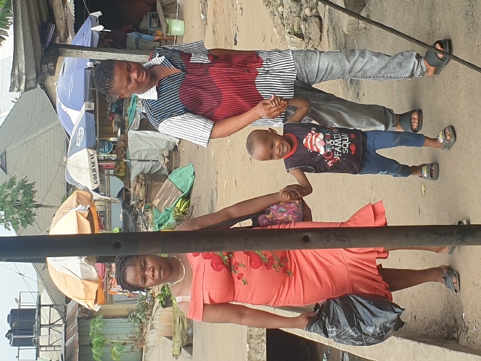 A family of three stands on a paved street. A woman in a peach dress and a black bag holds hands with a child wearing a Christmas-themed shirt. The child is also holding hands with a man in a striped shirt and gray pants. They are standing outdoors. The background features a street scene with a vendor under umbrellas and various buildings. A black metal pole dominates the lower portion of the frame.