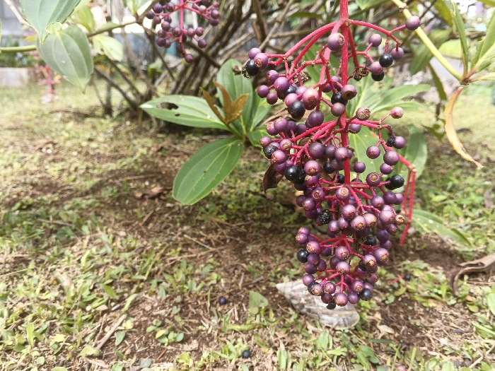 A cluster of red stems hangs heavy with purple berries, some near black, in an outdoor setting. The berries are round and densely packed. Background foliage includes large, green, glossy leaves. The ground is covered with mixed dirt, grass, and twigs. A snail shell rests beneath the hanging fruit. Other similar berry clusters are visible in the blurred background.