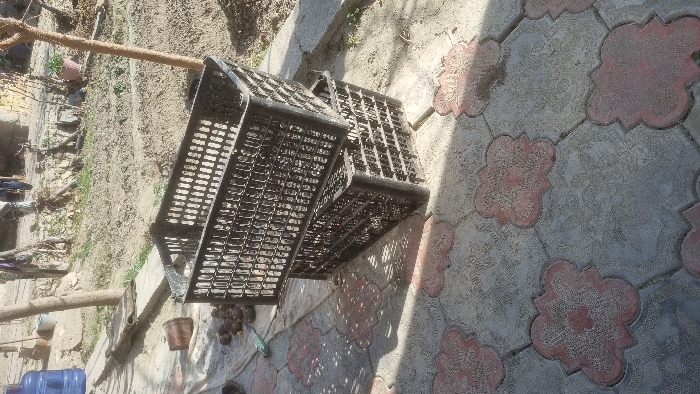 This image depicts an outdoor scene in Yangi-Khayat, Uzbekistan. In the foreground, a paved surface features interlocking light gray and reddish-brown pavers arranged in a repeating stylized pattern, casting distinct shadows from an overhead light source. Centrally positioned on this surface are two dark, rectangular plastic crates, stacked vertically. The top crate is empty and partially soiled. To the left of the crates, on a light-colored ground cover, are numerous dark, irregularly shaped objects, consistent with potatoes or root vegetables, alongside a small green object and a brown metal container. The midground and background consist of an unpaved, earthy area with dry soil and sparse vegetation. Several slender tree trunks or wooden posts are visible throughout this section. In the far left background, a large, blue plastic water bottle stands upright. Faint, blurred structures, potentially buildings or fences, and hanging items are discernible in the distant background. No individuals are present in the scene.