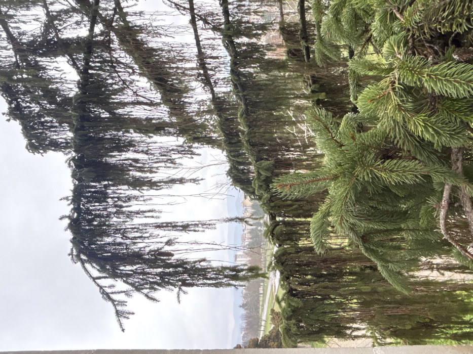 The image displays an outdoor scene in Veliko Tarnovo, Bulgaria, characterized by an overcast sky. The foreground is heavily populated by the dense, weeping branches of a coniferous tree, likely a spruce or fir, featuring dark green needles and some instances of lighter green new growth. A single, brown pine cone is visible hanging from an upper branch. A light-colored, vertical stone architectural element partially frames the left side of the composition. Through and beyond the coniferous foliage, a park area is discernible in the midground, comprising green grass, paved pathways, and multiple bare deciduous trees, indicative of late winter or early spring. In the background, an urban panorama unfolds, featuring several multi-story buildings and structures, with faint mountain or hill outlines visible on the distant horizon. No individuals, specific actions, or interactions are present within the frame.