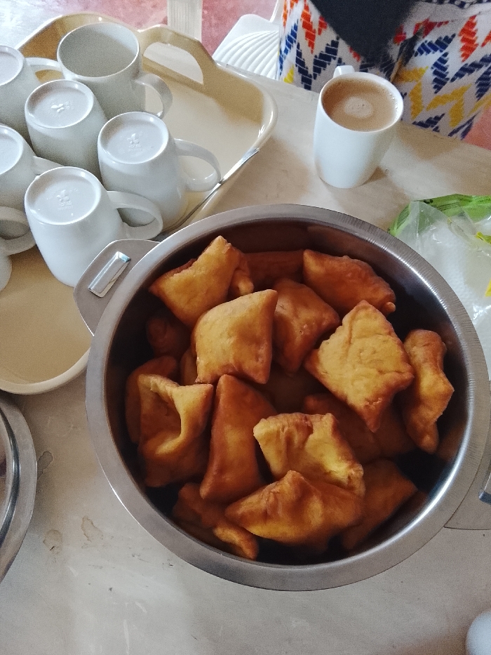 The image displays a close-up, elevated view of a food and beverage arrangement set on a light-colored surface within Kiambu Township ward, Kenya. Centrally, a large, polished stainless steel bowl with integrated handles is filled with numerous golden-brown, irregularly shaped, fried dough pastries, identified as *mandazi*. To the immediate left of the bowl, a cream-colored plastic serving tray holds at least six white ceramic mugs, predominantly inverted. One white ceramic mug stands upright near the tray's edge. A small, round, cream-colored saucer or plate is partially visible beneath the tray. In the upper right quadrant, a white ceramic mug contains a light brown beverage with a frothy surface, consistent with chai or coffee with milk. Adjacent to this mug, the upper shoulder and a portion of the head of an individual are visible, wearing a garment with a distinct geometric pattern composed of blue, white, yellow, and red elements. A partially visible translucent plastic bag rests to the right of the *mandazi* bowl. The underlying surface is light-colored and exhibits minor stains or discolorations.