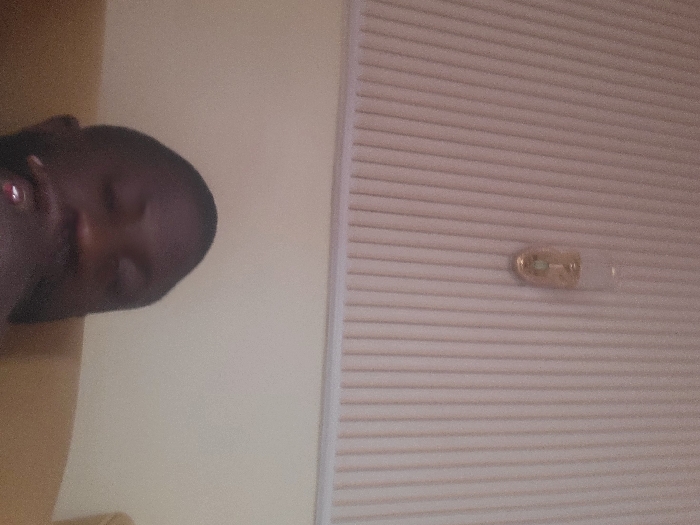 The scene depicts an interior location in Babawa, Nigeria. An adult male, appearing to be of dark complexion, occupies the lower portion of the frame, presented from the neck up. His eyes are closed or heavily lidded. His right hand is positioned near his mouth, with a reddish object, possibly a ring or painted nail, visible on one finger. He is reclining against a light brown, possibly upholstered, surface. The upper half of the image displays a light-colored wall or ceiling characterized by distinct vertical ridges. Affixed to this surface in the upper right quadrant is a translucent, elongated glass object, possibly a decorative light or an air freshener unit, containing a pale yellow liquid and a small greenish insert. No direct interactions or specific actions beyond reclining are discernible.