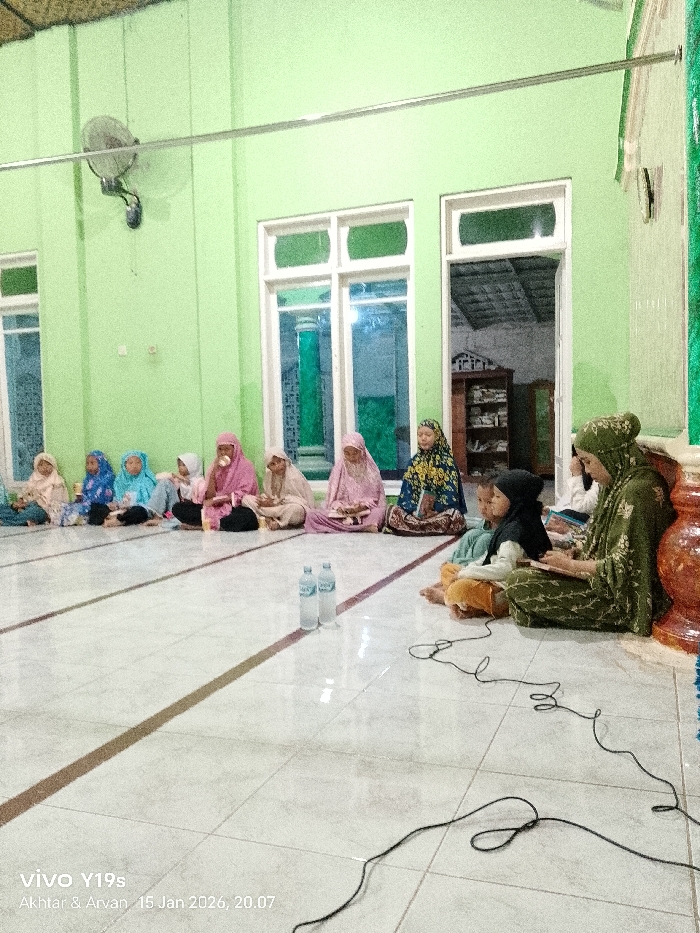 The image displays an indoor scene in Wanguk, Indonesia, captured at 8:07 PM on January 15, 2026. The environment consists of light green walls, a white tiled floor with dark grey grout lines, and two faint light-brown linear marks crossing the foreground. Three windows with white frames are visible in the background, with an open doorway to their right leading into another room containing a dark wooden bookshelf. A white wall-mounted fan is on the upper left wall, below a horizontal metal bar. Eleven individuals are present, predominantly females ranging from young children to adults, all seated on the floor. In the foreground to the right, an adult female wearing a dark green patterned hijab and matching clothing is seated, holding an open book or tablet. Adjacent to her are two young children, one wearing a black hijab and the other a light green shirt, both observing the book. Further back, eight individuals are arranged in a line, also seated on the floor. These individuals wear hijabs of various colors including pink, blue, light green, beige, and dark blue patterned fabric. Some individuals in this line appear to be holding books or similar items. One individual in the center, wearing a pink hijab, holds a white object near her mouth. Two clear plastic water bottles stand upright on the tiled floor in the central foreground. A black electrical cord extends across the floor from the bottom right corner towards the center, terminating near the water bottles.