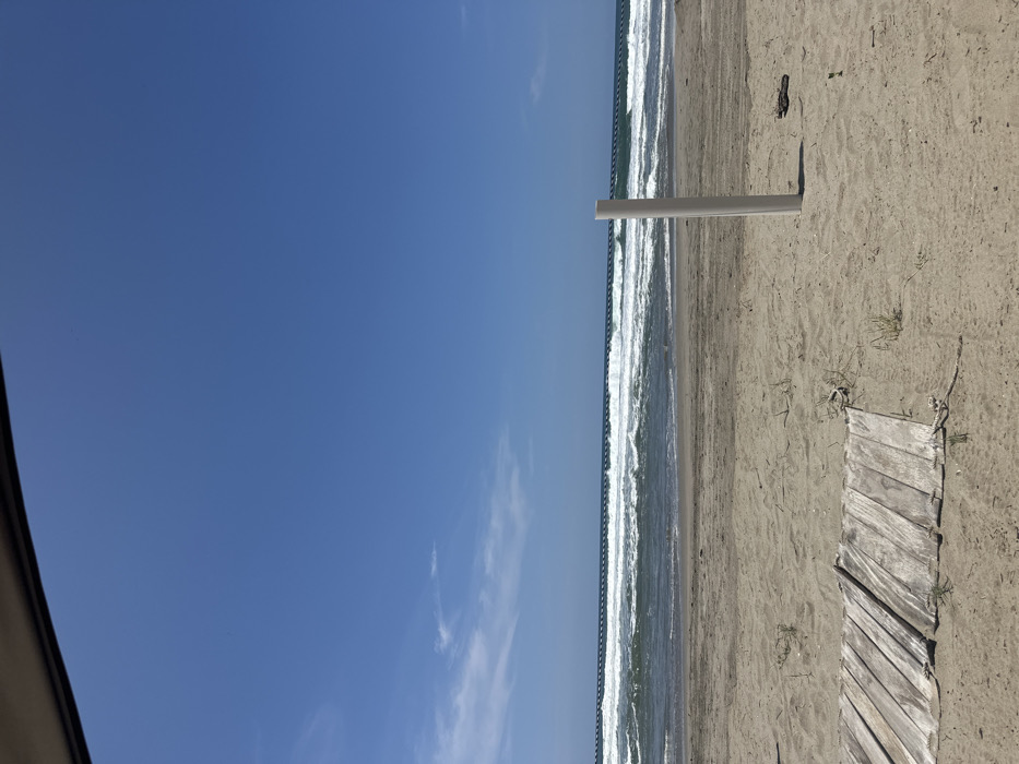 The image depicts a beach scene at Puerto Marqués, Mexico, under a clear blue sky with minimal cirrus clouds in the western sky. The upper edge of the frame shows a partial view of an overhead dark structure. The ocean, visible in the mid-ground, features multiple lines of white-capped waves breaking towards the sandy shore. A distinct dark, horizontal structure, composed of interconnected rectangular elements, extends across the distant ocean surface. The foreground consists of light brown sand with sparse dry vegetation. A weathered wooden walkway, constructed from approximately six planks bound by rope, lies flat on the sand in the lower-left quadrant. To its right, a single, light-colored cylindrical post, appearing to be made of PVC, stands vertically embedded in the sand, casting a short shadow. No individuals or active subjects are present.