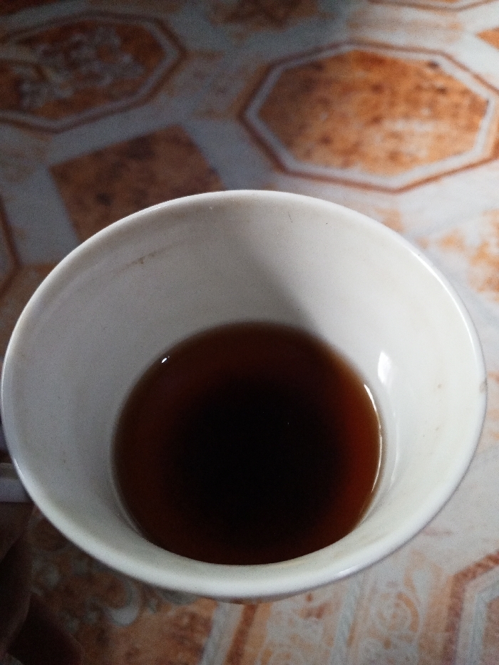 A white ceramic mug, approximately two-thirds full of a dark brown liquid consistent with coffee or tea, is centered in the frame. The liquid's surface shows minor reflections. The interior rim of the mug exhibits subtle dark discoloration. The mug rests on a surface with a repeating hexagonal tile pattern, featuring geometric shapes in shades of orange-brown and lighter off-white. The scene is situated in Calapi, Philippines. No individuals, actions, or direct interactions are visible.