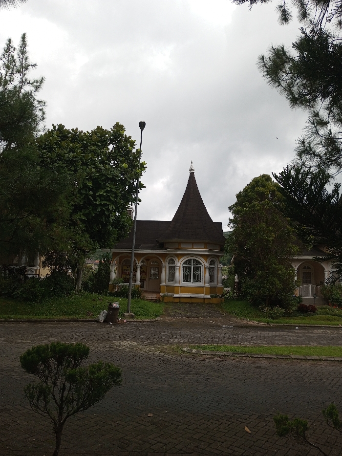 - "The image displays a distinctive yellow-painted building with white trim, featuring a dark, conical roof topped with a finial, situated in the city of Orehat, India" by FM-agByF3, licensed under CC BY 4.0