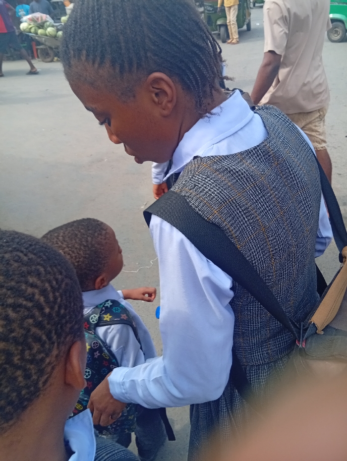 A young woman wearing a white collared shirt and a patterned grey vest stands on a street with children. She has her hair braided and is turned slightly away from the camera. Two young boys are visible near her, one wearing a patterned backpack. In the background, people and vehicles are seen, suggesting an urban or busy street scene. The lighting is bright, indicating it is daytime.