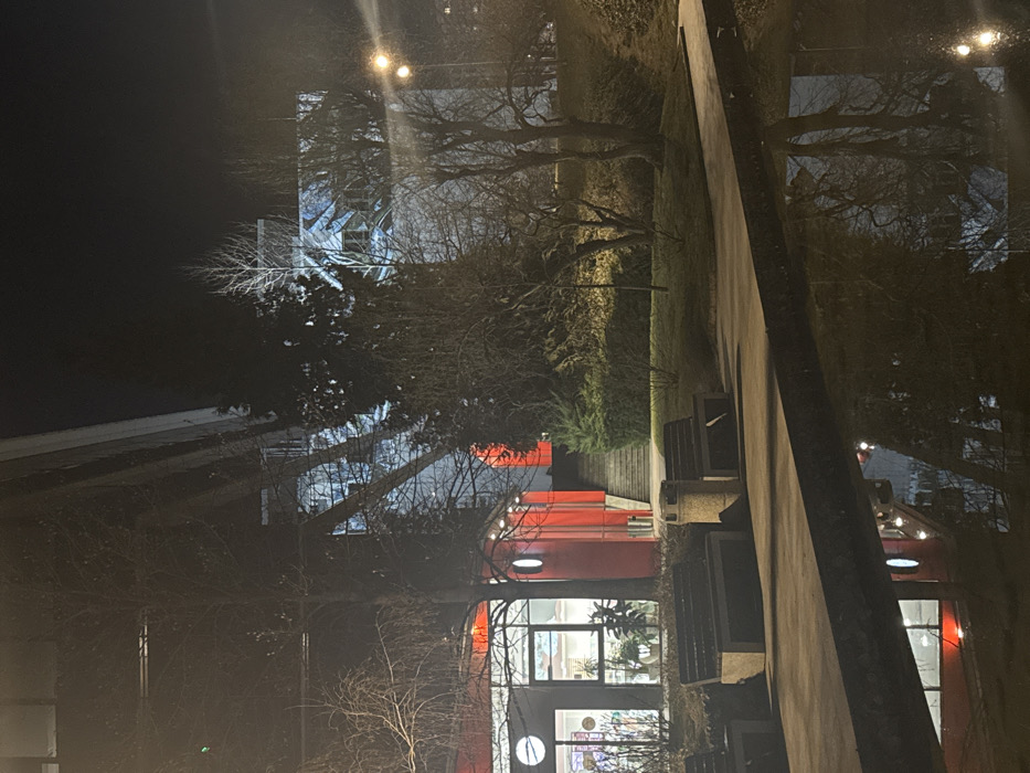 This nighttime image depicts an urban park environment in Sofia, Bulgaria, specifically within the National Palace of Culture (NDK) complex. The scene is illuminated by artificial lights, casting reflections in a foreground water feature. In the immediate foreground, a dark, still body of water or reflective pool occupies the lower quarter of the frame, mirroring the overhead light sources and the red building to the left. A concrete edge separates this water from a paved pathway. To the left of the pathway, two concrete benches with dark slatted seats are visible. Between them and slightly to the right stands a cylindrical concrete trash receptacle with a metal lid. Further to the right, a third similar bench is partially obscured. The left midground is dominated by a single-story building featuring a prominent red facade with large plate-glass windows. A circular white logo with a horizontal line passes through it is affixed to an upper window pane. The interior is brightly lit, revealing potted plants. Adjacent to this building and extending rightward, a concrete staircase with red-clad walls ascends an incline. The central and right midground features a grassy area with numerous deciduous trees and shrubs, mostly bare of leaves, indicating a cold season. Some patches of grass and foliage are illuminated by a soft, yellowish light source. In the background, a large, light-colored building, possibly white or light grey, rises behind the red structure and trees. It exhibits multiple windows and a seemingly modern, angular architectural style. A streetlight with two visible lamps emits a yellowish glow from the far right background, partially obscured by tree branches. No individuals are present in the scene.