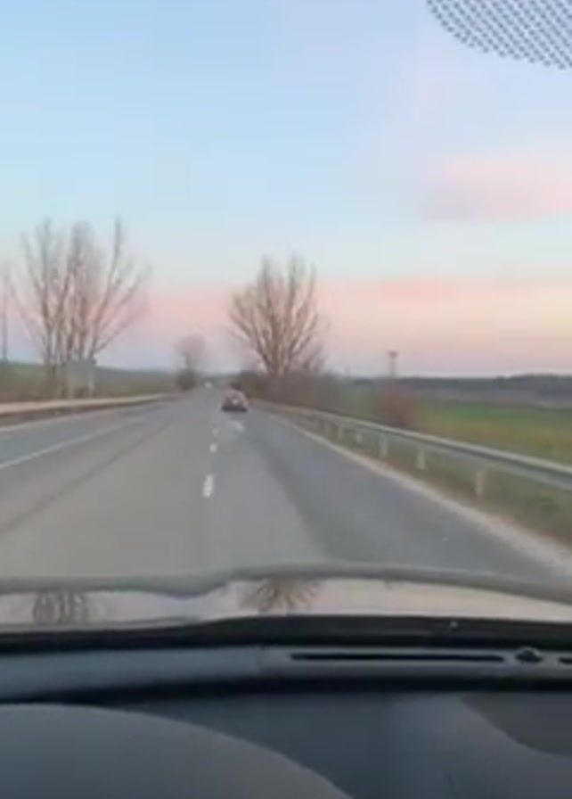 A person is driving a car on a highway at sunset. The driver's left hand is visible on the steering wheel, wearing a watch. The dashboard and gauges are visible, indicating a speed of around 107 kilometers per hour. The road has two lanes in each direction, separated by a white line. Guardrails line the side of the road. Trees with bare branches are present on the side of the road, and fields extend into the distance. Another car is visible ahead in the same lane. The sky is a mix of blue and pink hues from the setting sun.