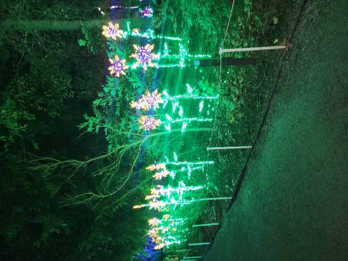 A nighttime shot shows trees lit with festive displays. The trees are adorned with multi-colored, snowflake-shaped lights. The lights emit a vibrant glow, illuminating the surrounding greenery and creating a magical effect. The ground is dimly lit and appears to be a path or walkway. The scene is dark, with the focus on the luminous displays of the Christmas light decorations.