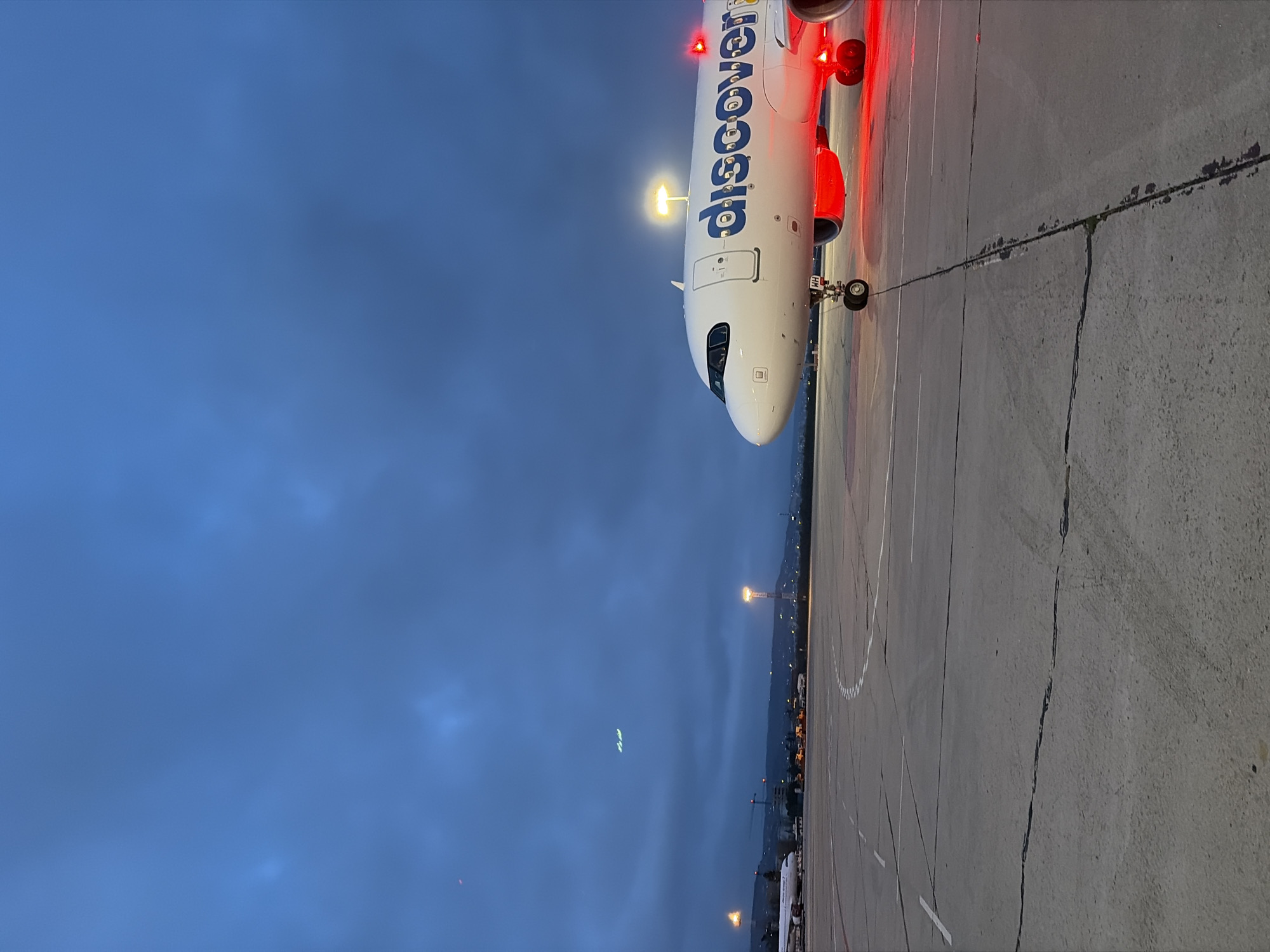 The image depicts an airport tarmac scene at dusk or early night, located in Aksakovo, Bulgaria. The primary subject is the front section of a white passenger aircraft positioned on the right half of the concrete apron. The aircraft features the word "discover" in blue capital letters along its fuselage. Red anti-collision lights are illuminated beneath the aircraft's belly and on its visible wingtip, while a yellow service light shines from the top of the fuselage. The front landing gear, marked "WH," is visible. The concrete tarmac displays visible expansion joints and minor surface cracks, along with white painted ground markings. In the mid-ground on the left, another white passenger aircraft is partially visible. The background reveals several tall floodlight poles emitting bright yellow light, illuminating portions of the distant ground and structures. A dark, undulating horizon line suggests the presence of hills or low mountains. The sky is a deep, dark blue, overcast with visible cloud formations. No individuals or specific actions are discernible within the frame.