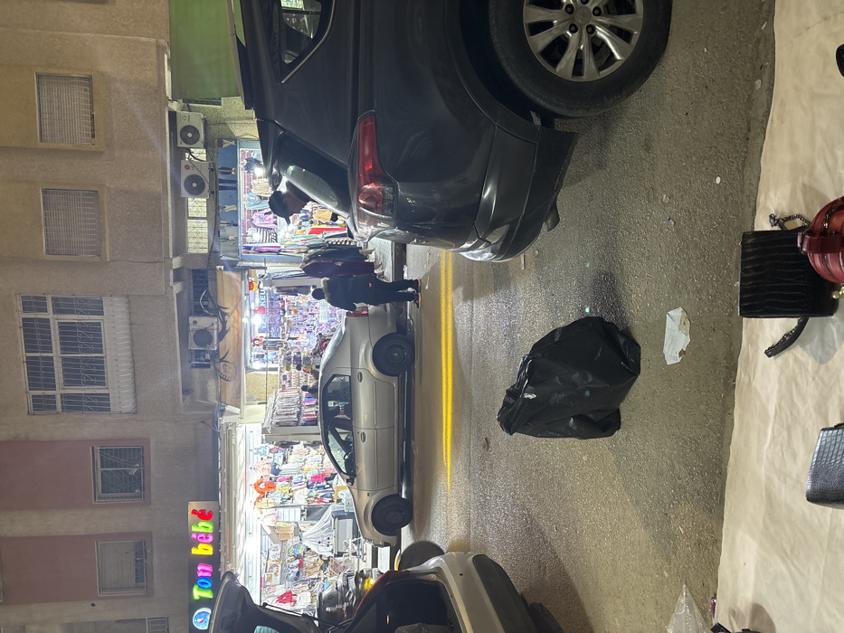This image depicts a nighttime street scene on Boulevard Prince Héritier SIDI MOHAMED in Fez, Morocco, specifically in a commercial district. In the immediate foreground, a white sheet or tarp is spread across the pavement, displaying various small bags and purses, including a black one with a textured finish and a round red one, suggesting a street vendor's setup. Slightly further into the scene, a black plastic bag rests crumpled on the asphalt, surrounded by small pieces of white debris. Yellow light streaks are visible on the wet or reflective street surface. In the mid-ground, a silver sedan is parked or stopped, oriented to the left. To its right, the rear of a dark-colored SUV is visible, with its hatch open. A male individual, wearing a dark baseball cap, is leaning into the open trunk of the SUV, appearing to load or unload items. Another person, dressed in dark clothing, stands on the sidewalk next to the silver sedan, facing towards the shops. The front section of a light-colored vehicle, also with its trunk open, is partially visible on the far left. The background is dominated by a row of brightly illuminated commercial shops. The shop on the left features a prominent neon sign reading "Ton bébé" and displays a wide array of colorful baby clothing and accessories. The adjacent shop to its right exhibits various garments and fabrics, with mannequins visible. Above the storefronts, the building rises several stories, featuring windows with white grilles or shutters and mounted air conditioning units. The overall environment is illuminated by the artificial light from the shops and streetlights.