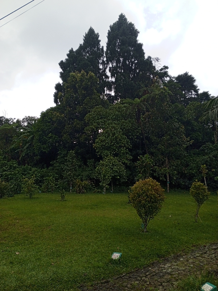 A verdant lawn with scattered small trees and bushes leads to a dense forest. Towering evergreen trees dominate the background, their pointed shapes rising into a cloudy sky. The forest floor is thick with various trees and vegetation. Signs mark points on the lawn. The scene suggests a natural or landscaped area, possibly a botanical garden or park, on a slightly overcast day.