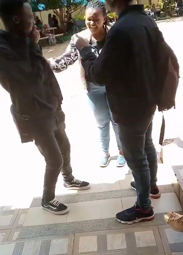 Three people stand in an outdoor courtyard area. The person on the left wears a dark outfit and black and white sneakers, and is smiling while holding their hand up to their mouth. The person in the middle is smiling, wearing jeans and a patterned jacket. The person on the right is wearing a black jacket, jeans, and black sneakers. They have a backpack slung over their shoulder, and point at the person in the middle. There is a building in the background, as well as other people sitting on benches in the courtyard. The ground has square gray tiles.