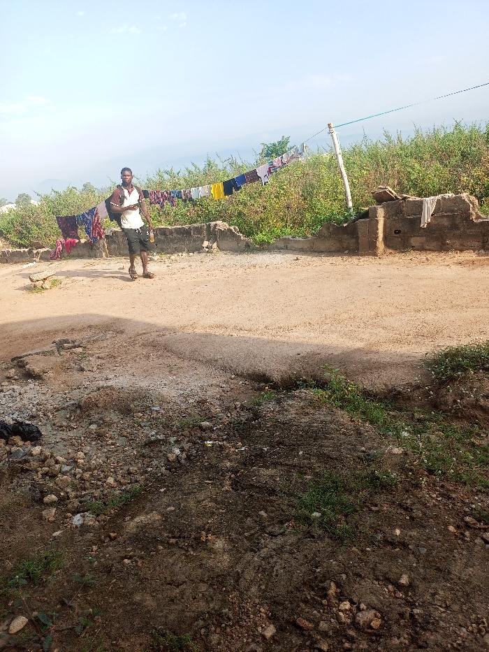 This image depicts an outdoor scene in Zango-ndaji, Nigeria, under clear daytime conditions. A single adult male, approximately 20-30 years old, with dark skin, stands slightly left of the center. He is wearing a white collared short-sleeve shirt, dark shorts, and dark open-toed footwear. A dark backpack is slung over his left shoulder, and he holds a small, light-colored bottle in his right hand. He faces forward, looking towards the camera. The ground in the immediate foreground is uneven, comprised of dark earth mixed with gravel and rocks, with sparse green vegetation. A black plastic bag is visible on the far left. Beyond this, a flatter, wider expanse of light brown packed dirt or gravel extends across the middle ground. Along the rear of this expanse, a partially collapsed concrete block wall, approximately waist-height, runs horizontally. To the left of the man, a concrete slab or bench-like structure rests on the ground near the wall. Above and behind the wall, a clothesline made of a thin rope or wire is strung between a white pole on the right and an unseen point to the left. Numerous items of clothing, including shirts, trousers, and fabric pieces of various colors, are hanging to dry. Dense green bushes and overgrown vegetation are visible behind the clothesline and wall, extending into the background. Distant, hazy hills or mountains are discernible beneath a light blue sky with faint cloud formations, forming the horizon.