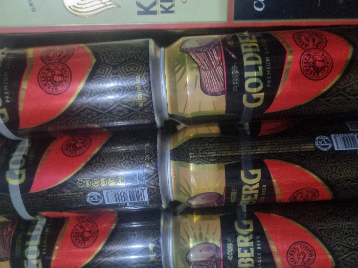 close-up view of several cans of Goldberg beer stacked together. The cans have a gold, black, and red color scheme with distinct patterns and the brand name prominently displayed. Some cans have a drum graphic on the gold section. Text on the cans reads "PREMIUM LAGER BEER" and "NET CONTENT: 500ml". The top of a box labeled "K" is also partially visible in the background.
