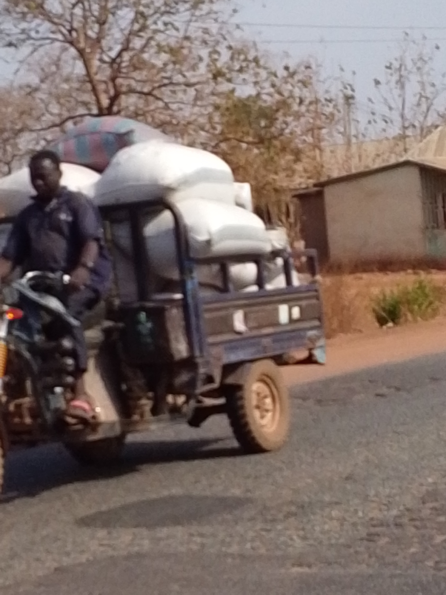 A dark-skinned adult male, wearing a dark blue short-sleeved collared shirt, operates a dark blue three-wheeled motorized cargo vehicle on a paved road in Dungu, Ghana. The vehicle's rear bed is heavily loaded with numerous large, white sacks, topped by additional striped sacks (pink and blue), stacked high. The scene is illuminated by direct sunlight, casting shadows on the road surface. In the background, to the right, is dry, reddish-brown ground with sparse vegetation, including leafless trees and green shrubs. Two light-colored buildings, one with a dark brown entrance and another with a corrugated roof, are visible amidst the sparse foliage.