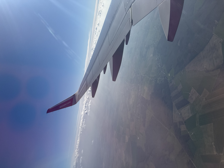 The image presents an aerial view captured from the window of an aircraft, primarily featuring the right wing