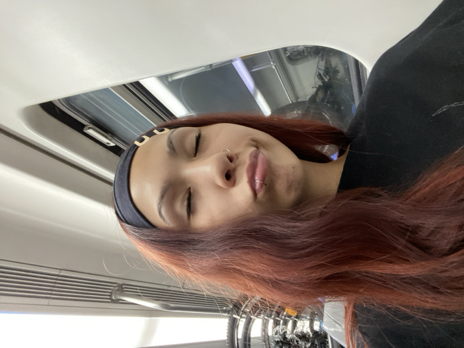 A woman with auburn hair, wearing a black headband and a black shirt, is on public transportation. Her eyes are closed and she has piercings on her nose and lip. A window is visible behind her with a row of bicycles in the background. The interior of the vehicle, including the ceiling and ventilation, is visible.