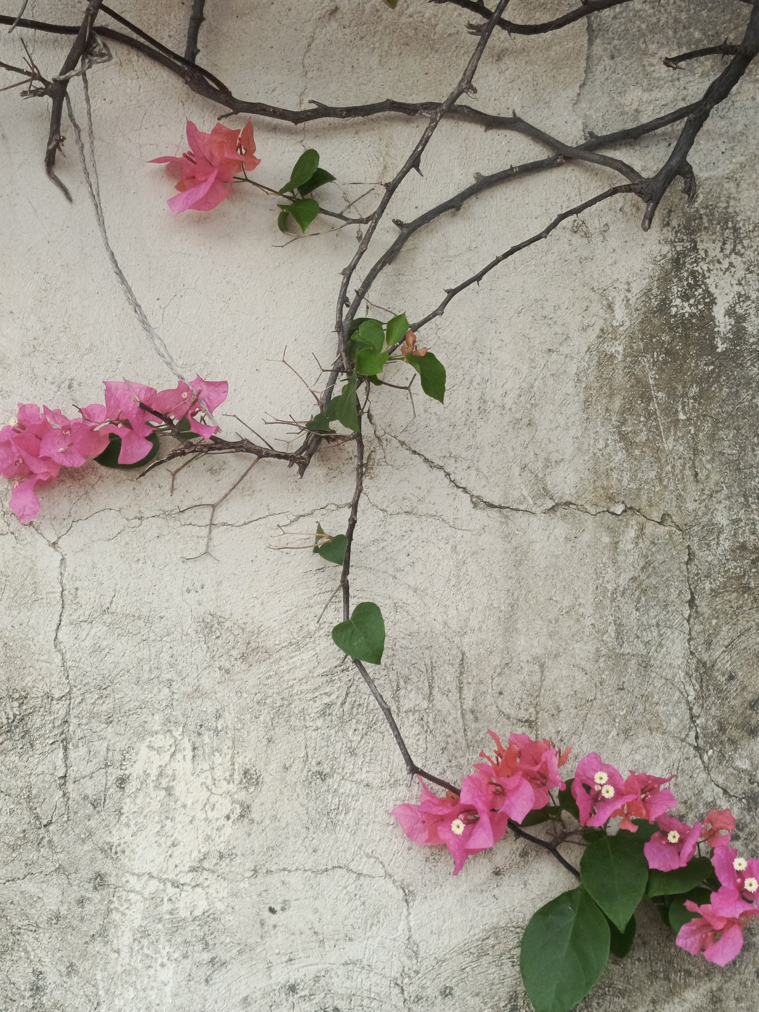 The image depicts a section of a weathered, light gray concrete wall in Tinaco, Venezuela. The wall surface exhibits cracks, stains, and textural variations, suggesting age and exposure to the elements. A thorny, woody vine climbs across the wall's surface, featuring clusters of vibrant pink bougainvillea flowers and interspersed green leaves. The flowers and leaves are concentrated in the upper left, center, and lower right portions of the frame. The vine branches are mostly bare, indicating a dormant or drier period.