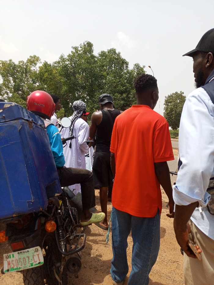 six men standing in front of a motorcycle in a dirt lot. The man on the motorcycle is wearing a blue shirt and a red helmet. He is sitting on a motorcycle with a blue case on the back. There are several other men standing around. One man is wearing a red shirt and blue jeans, and another is wearing a white shirt and black pants. They are looking at something that is out of the frame. In the background, there is a building and trees. The image was taken at latitude: 9.01, longitude: 7.416. This location is in the city of Karonmajigi, Nigeria.