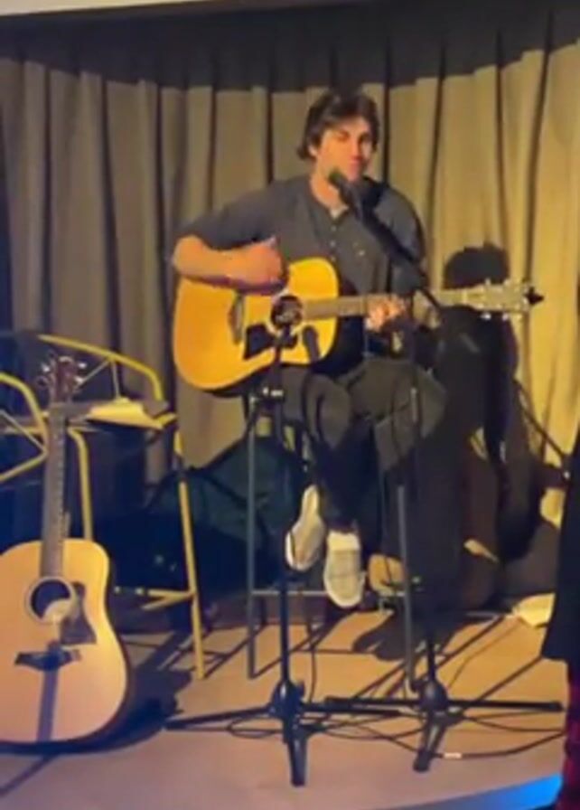 A man is seated on a tall stool, playing an acoustic guitar and singing into a microphone. He is wearing a grey shirt, dark pants, and off-white casual shoes. Another acoustic guitar is placed on a chair to his left. He is on a small, elevated stage with a dark curtain behind him. The stage is lit with colored lights. An individual in dark clothing and a red pattern is partially visible to the right of the frame.