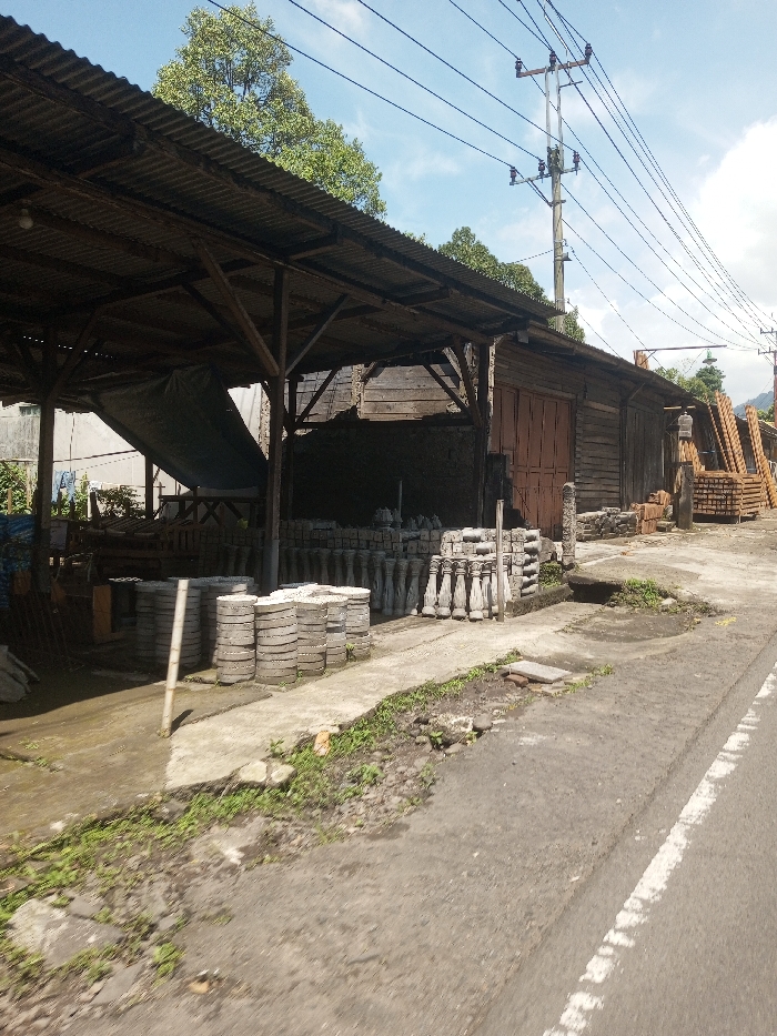 This image, identified as being in Ura-Dozhi, Bhutan, depicts a roadside industrial or commercial scene under a bright, partly cloudy sky. In the foreground, a dark asphalt road with a partial white shoulder line is visible on the right, alongside a concrete pathway interspersed with dirt and green weeds. On the left, an open-sided structure features a weathered corrugated metal roof supported by wooden beams. Beneath this shelter, numerous pre-cast concrete items are arranged: several stacks of circular grey concrete slabs or pavers are positioned on the concrete ground, alongside multiple upright rows of ornate grey concrete balusters or pillars. A dark tarpaulin is draped over unspecified objects deeper within the shed, where a bare light bulb hangs from the roof structure. Adjacent to the open shed on the right is a single-story wooden building, characterized by horizontal plank siding and a set of prominent brown double doors facing the road. Outside this building, further stacks of the ornate concrete balusters are visible. A tall utility pole, likely made of concrete or metal, stands behind the wooden structure, supporting multiple power lines that extend across the upper portion of the frame. Green tree foliage is visible in the background, above the buildings. No individuals are present in the scene.