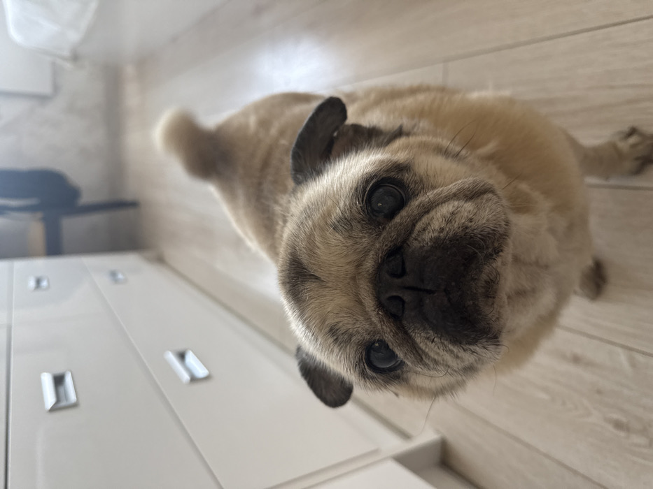- "The image displays a fawn-colored pug standing on a light wooden floor within an indoor setting in Cherven Bryag, Bulgaria" by FM-9wgNg2, licensed under CC BY 4.0