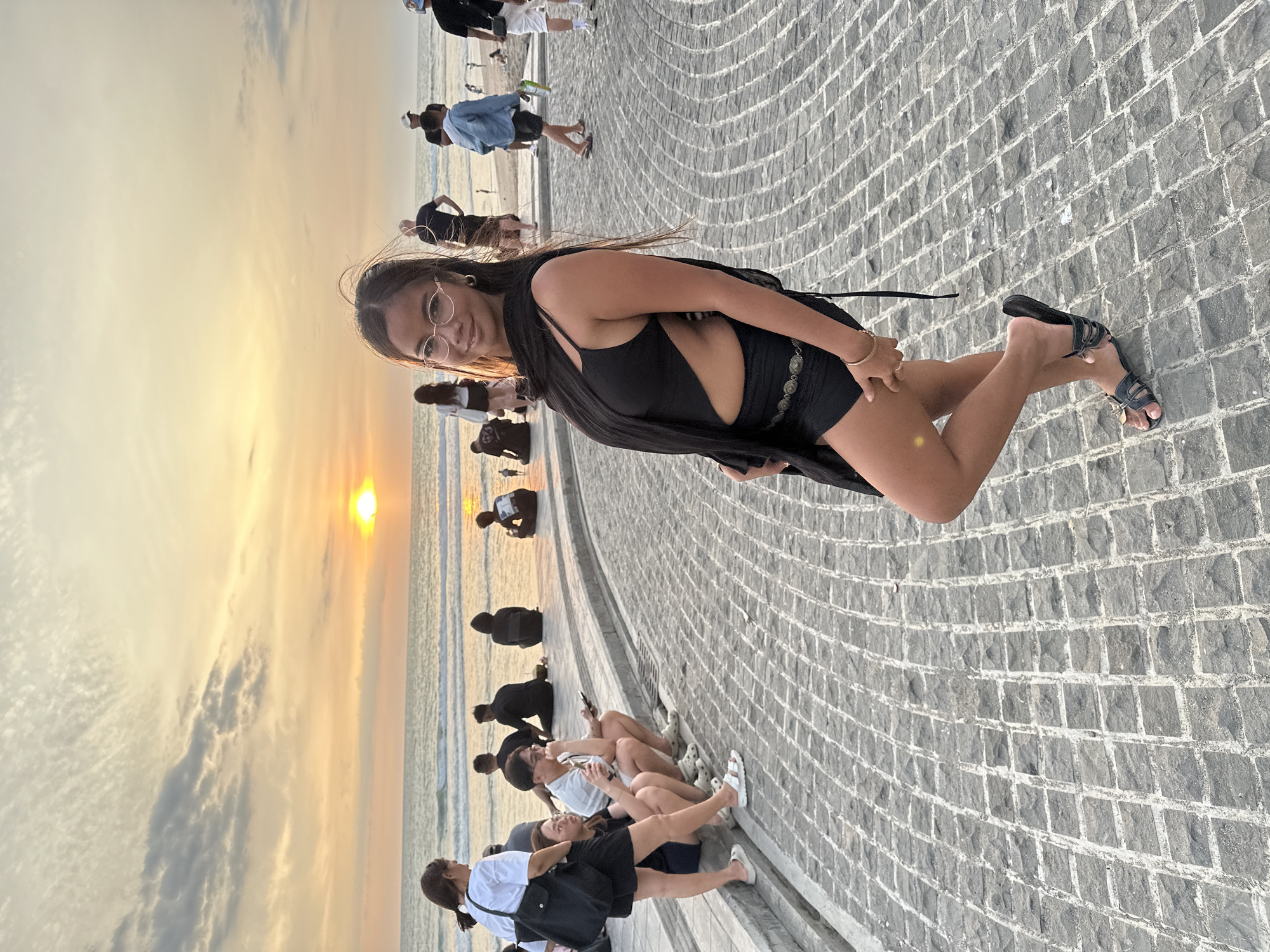 The image displays an outdoor scene at sunset in Kerobokan Kelod, Indonesia. A paved area of dark gray, square cobblestones, laid in a grid pattern, occupies the foreground. A female individual stands in the foreground, positioned slightly right of center, facing the viewer with a subtle smile. She has long, dark hair and wears light-colored, round-framed glasses. Her attire includes a black garment, possibly a one-piece swimsuit or top with side cutouts, black shorts, and a black wrap draped over her shoulders and torso. A silver-toned, ornate belt is visible around her waist. She wears dark sandals with a metallic detail on the strap. Her left hand rests on her hip. To the left in the midground, a group of individuals is gathered on and beside a curved concrete ledge. Three people are seated on the ledge, one actively using a smartphone. Another female, dressed in a white t-shirt and black shorts, stands next to the seated group. Beyond this ledge, on a sandy beach, several other individuals are visible standing or sitting, facing the ocean. The background features the ocean with discernible waves. The sun is setting directly on the horizon, creating a bright orange and yellow glow across the water. The sky above transitions from these warm hues near the horizon to lighter tones, with scattered white and gray clouds present.