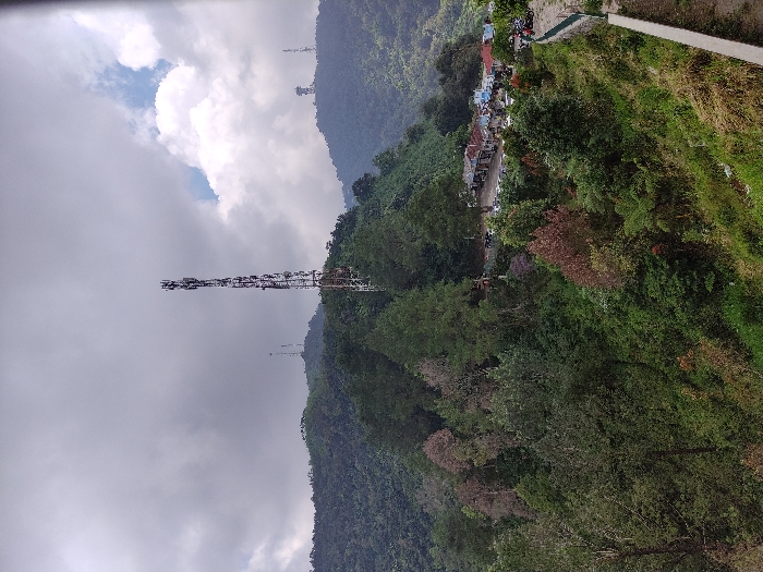 Lush green mountain landscape under a cloudy sky. Tall communication towers rise above the dense foliage. A cluster of buildings and vehicles is visible on a road winding along the mountainside. The scene suggests a remote, possibly hilly area with infrastructure for communication. The image is rotated clockwise.