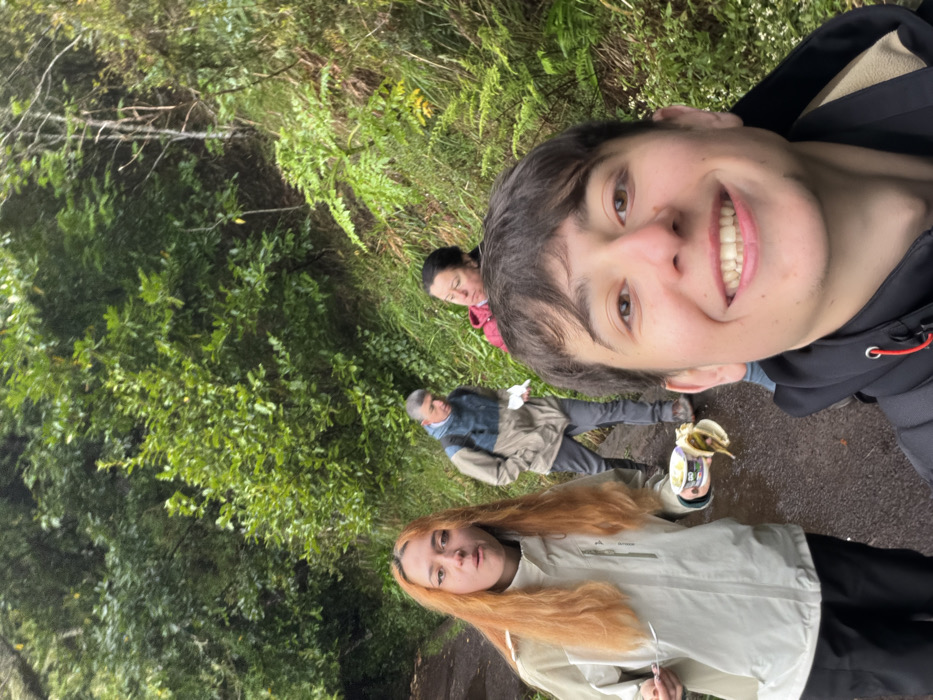 An outdoor scene in Santana, Portugal, depicts four individuals on a wet, dark path bordered by dense green vegetation. In the immediate foreground, a young male, approximately 18-25 years old with short brown hair, smiles directly at the camera while taking a selfie. To his left and slightly behind him, a young female, approximately 18-25 years old with long reddish-brown hair, is seen with an open mouth, holding a white plastic fork in her right hand and a white container with food, alongside a banana peel, in her left hand. She wears a light-colored jacket. Further back on the path, an older male, approximately 50-65 years old, wearing a two-tone jacket, holds a white napkin and looks downward. To his right, an older female, approximately 50-65 years old, wearing a red jacket, gazes to her left. All individuals are dressed in casual outdoor attire. The background consists of a steep embankment covered with lush green foliage, including trees and ferns, indicating a natural, possibly forested, environment.