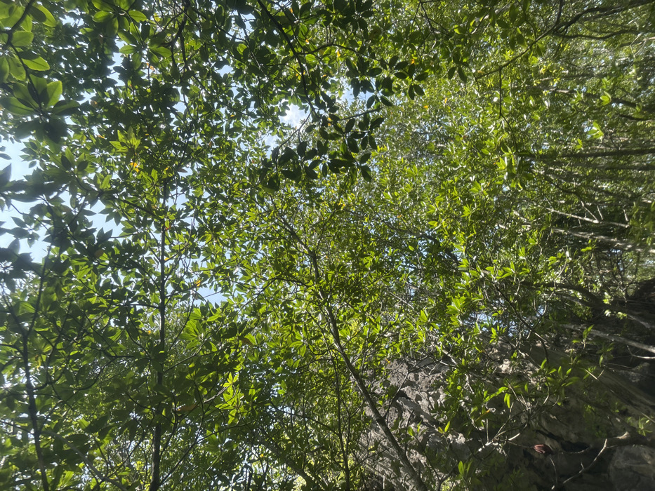 - "The image displays an upward view through a dense, vibrant green tree canopy under a clear to partly cloudy blue sky, located in Krasom, Thailand" by FM-E1hwL2, licensed under CC BY 4.0