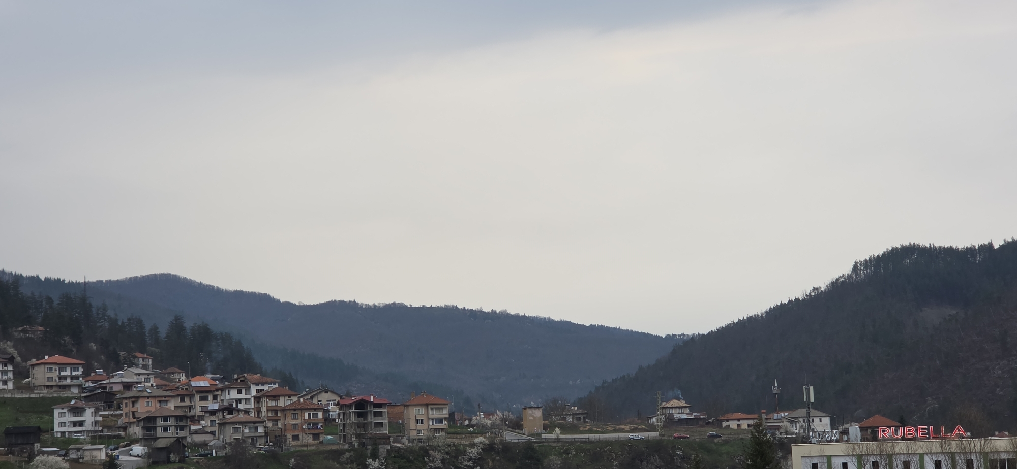 The image captures a view of Rudozem, Bulgaria, under an overcast sky
