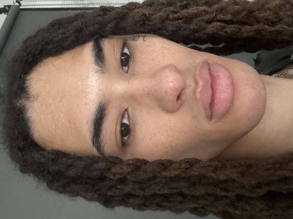 A close-up of a person's face, tilted slightly. They have brown eyes, thick eyebrows, freckles, and full lips. A small tattoo is visible above one eyebrow. The person's skin appears slightly sweaty. Brown dreadlocks frame their face. The image is well-lit and focuses primarily on the facial features.
