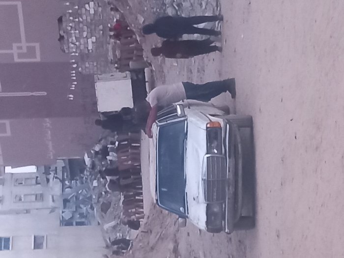 The image depicts an outdoor scene in Khan Yunis, Palestinian Territory, characterized by urban damage and debris