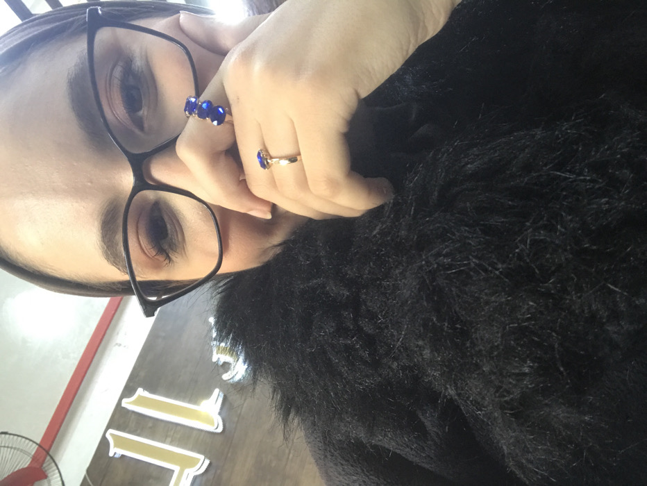 A close-up, chest-up selfie captures a young woman seated indoors in the city of Meknes, Morocco. She is facing the camera, smiling, and looking directly at the viewer. Her right hand is raised, with her fingers partially covering her mouth. She wears black-framed eyeglasses and a dark headscarf. Her outer garment is a thick, black, fur-like coat or jacket. On her right hand, she wears two gold-colored rings: one on her middle finger featuring three stacked oval blue gemstones, and another on her ring finger with a single oval blue gemstone. In the upper left background, a portion of a red and white ceiling fan is visible. Behind her, a wooden-paneled wall features an illuminated sign with golden-colored Arabic script, partially visible as "ول".
