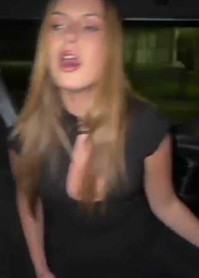 A young woman with long blonde hair is seated in the back of a car. She wears a black jumpsuit with a cutout at the chest. The car is dark, and streetlights are visible through the window. She is dancing and singing along to music. She appears to be enjoying herself.